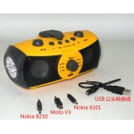 產品介紹: 1.手搖發電. 2.手搖發電、手搖可給手機及數碼產品充電 3.四顆超亮LED燈. 4.AM/FM. 5.閃燈警報. 6.支持SD卡及U盤音樂播放,可作為PC,手機,MP3等設備的外放音箱. 7.可用4節5號電池供電. 產品規格: 1.材質:ABS、PS 2.LED燈的規格:¢5; 4個LED、LED的亮度:2500MCD; 3.電池類型:聚合物鋰電電池 1000mAh 3.7V 4..手搖發 電3小時可充滿,電源適配器5小時可充滿:a)照明可15小時 b) 收音機可用7小時(sd播放3—5小時),c)警報3小時。